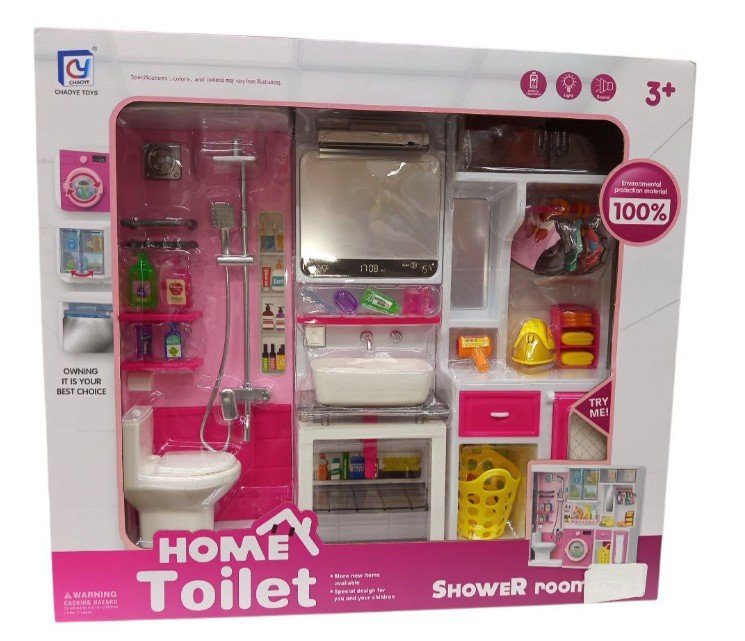 Набор мебели для кукол "Туалетная комната" (душ, унитаз, раковина, зеркало, гладильные принадл.) с аксессуарами, на батарейках, в коробке 818-331