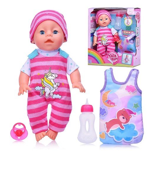 Очаровательный малыш обязательно станет постоянным участником сюжетно-ролевых игр девочки. Размер пупса - 35 см. Туловище игрушки выполнено из пластика; голова, ручки и ножки - из ПВХ. Части тела подвижные. Глазки закрываются. Пупс одет в футболку с коротким рукавом, комбинезон и шапочку из вязаного трикотажа. Пупса можно купать, переодевать, менять подгузник, кормить, поить из бутылочки и садить на горшок. В комплекте аксессуары: соска, бутылочка, горшок, тарелочка, ложечка, подгузник, конверт для малыша. Такая комплектация разнообразит игру и сделает её ещё интереснее и реалистичнее.