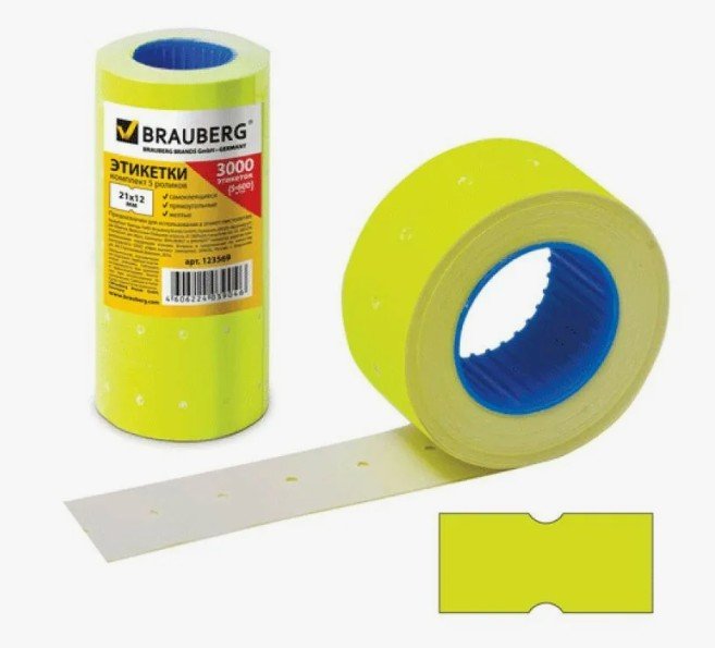 Этикет-лента 21*12мм прямоугольная, желтая, рулон 600 шт., BRAUBERG, 123569