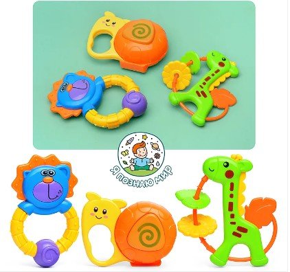 В наборе: 3 игрушки.\nДлина погремушек: 7 – 10 см.\nМатериалы: пластмасса, полимерные материалы.\nСоответствует требованиям безопасности продукции.\nДля детей от 3-х лет.