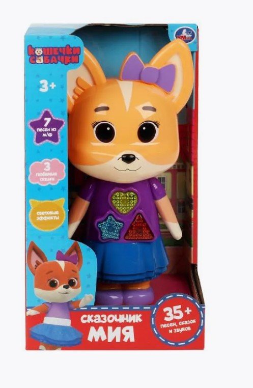 Развивающая игрушка «Мия-сказочница» ТМ «УМка» станет прекрасным подарком для маленьких поклонников мультсериала «Кошечки - собачки»: - 35+ песен, сказок и звуков; - 7 песен из м/ф (фрагменты): «Заставка», «Про город», «Новая игра», «Чудеса дружбы», «Считалочка», «Яблочный пирог», «4 колеса»; - 3 любимые сказки: «Теремок», «Заюшкина избушка», «Репка»; - забавные звуки; - световые эффекты; - высокое сходство с персонажем. Развивающие игрушки помогают ребенку развиваться физически, эмоционально и интеллектуально. Вашего малыша приведёт в восторг эта игрушка в виде героини популярного мультсериала с тремя крупными кнопками разной формы.
